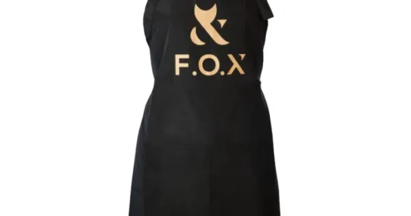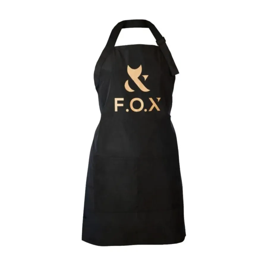 Delantal F.O.X: un delantal universal para manicuristas en color negro con el logotipo de la marca.